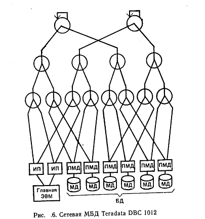 К классу сетевых относится коммерческая МВД фирмы Teradata DBC 1012, которая интенсивно распространяется и находит широкое применение в разлиных информационных системах. На рис. 6 изображена конфигурация DBC 1012 с восемью обрабатывающими процессорами ПМД (на базе i80386), каждый из которых имеет НМД и подключается к коммуникационной сети типа двоичного дерева (Y-сеть). В узлы этой сети встроены сетевые высокоскоростные процессоры и программируемые логические матрицы, реализующие функции управления сетью. Y-сеть позволяет осуществлять дуплексный обмены между обрабатывающими процессорами. В эту же сеть подключаются коммуникационные процессоры (ИЛ) для осуществления интерфейса с главной ЭВМ. Каждый обрабатывающий процессор обеспечивает поддержку всех операций реляционной алгебры, достаточных для выполнения операторов SQL, поддержку своей части БД, а также выполнение всех функций управления транзакциями над своей частью БД, в том числе защиту целостности, восстановления и т. д. Образцы DBC 1012 включают до 128 процессоров и имеют распределенную по обрабатывающим процессорам полупроводниковую память емкостью 412 Мбайт на один процессор. Общая емкость массовой памяти составляет до 1000 Гбайт и общее быстродействие - до 10^9 опер./с.