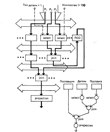 Появление на входе компаратора кортежа исходного отношения для операции селекции (select) или двух исходных кортежей для операции соединения (join) активизирует его, и после выполнения операции и выдачи результирующего кортежа он переходит в состояние ожидания. Процессоры сортировки отношений подключаются перед бинарными операциями или перед операцией удаления дублей. Промежуточная память используется для зацикливания потока кортежей, если длина дерева запроса больше числа строк в обрабатывающей матрице, или для передачи промежуточных отношений между двумя деревьями запросов.