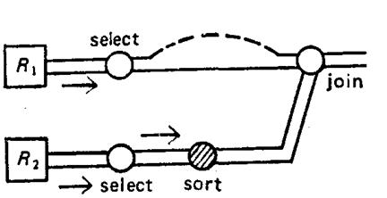 Необходимо отметить, что даже применение аппаратных потоковых сортировщиков не решает полностью проблему потокового выполнения бинарных операций. Сортировщик может начать выдачу кортежей сортированного отношения только после получения на входе последнего кортежа исходного отношения, да и то с задержкой. Например, процессор сортировки в Delta имеет задержку (2lm+N-1)t, где l-длина кортежа в байтах, t=ЗЗО нс-время пересылки байта между сортирующими элементами, m-число сортируемых кортежей, N - число сортирующих элементов. Таким образом, наличие даже аппаратной потоковой сортировки прерывает и замедляет общий поток кортежей между реляционными операциями. А любое замедление входного потока одного отношения-операнда требует для другого операнда бинарной операции наличия промежуточного буфера. Поэтому конвейер кортежей при потоковой обработке должен иметь вид «растягиваемых рукавов» (рис. 11). Все это может свести к минимуму преимущества потоковой обработки.