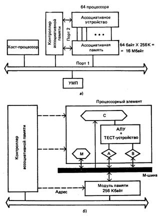 Структура каждого процессорного элемента изображена на рис. 12.б. Каждый процессорный элемент содержит АЛУ и тест-устройство, два входных регистра А и В, регистр маски М и блок регистров С. Все эти устройства выходят на внутреннюю шину памяти (М-шину). Процессорный элемент и модуль памяти реализованы двумя кристаллами. Общий контроллер управляет синхронной работой всех процессорных элементов, воспринимает результат и при поиске постоянно фиксирует текущий адрес в пределах 256К, с которым 8 данный момент работают процессорные элементы. Факт нахождения релевантной информации в каждом процессорном элементе фиксируется в контроллере Для последующего извлечения информации. В такой ассоциативной памяти наиболее эффективно реализуется операция поиска вхождений по заданному образцу. Особый интерес представляет использование такой памяти в машинах баз знаний, где операция поиска вхождений по образцу является основной.