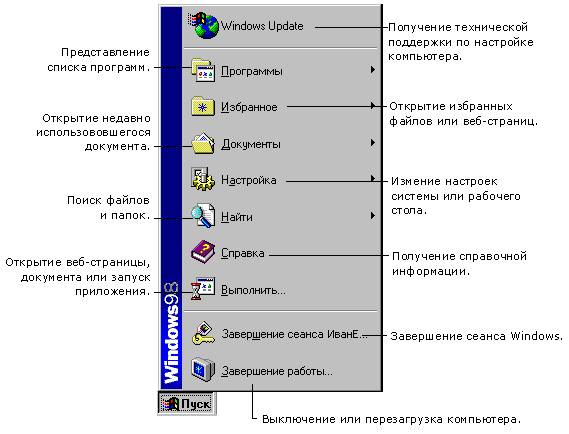 Практически любую операцию в Windows можно выполнить с помощью кнопки Пуск или панели задач. Панель задач и кнопка Пуск всегда доступны на рабочем столе, сколько бы окон не было открыто. С помощью кнопки Пуск можно выполнить практически любую задачу. Она позволяет запускать программы, открывать документы, настраивать систему, получать справочные сведения, осуществлять поиск по компьютеру и многое другое. Некоторые пункты меню «Пуск» обозначены направленной вправо стрелкой. Это означает наличие еще одного меню. Если поместить указатель на пункт меню со стрелкой, появится другое меню.