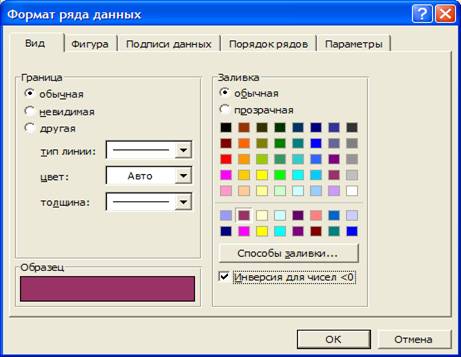 Все форматы, рассматриваемые в данном разделе, задаются на вкладке Вид (Patterns). Чтобы вывести эту вкладку на экран, выделите элемент, который вы хотите отформатировать, и выберите первую команду в меню Формат. Затем, после открытия окна диалога, перейдите на вкладку Вид. На рисунке 23 показан типичный вид этой вкладки (конкретный набор имеющихся здесь параметров зависит от типа текущей диаграммы).
