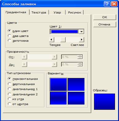 В любом случае, чтобы задать градиентную заливку, на вкладке Вид нажмите кнопку Способ заливки (Fill Effects) и затем после открытия окна диалога перейдите на вкладку Градиентная (Gradient), показанную на рисунке 24.
