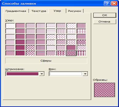 Подобно двухцветной градиентной заливке, узор позволяет смешивать два цвета, которые в этом случае называются цветом фона и цветом штриховки. Но в узоре два цвета чередуются в соответствии с повторяющимся геометрическим шаблоном. Чтобы задать узор, на вкладке Вид (Patterns) нажмите кнопку Способ заливки (Fill Effects) и затем, после открытия окна диалога, перейдите на вкладку Узор (Pattern), показанную на рисунке 25.