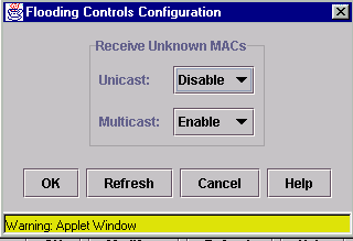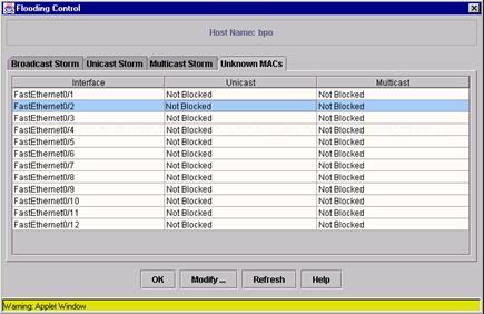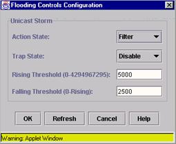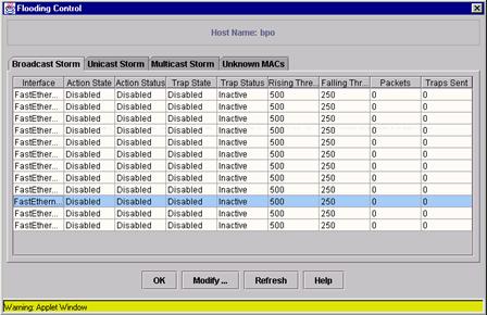 Он состоит из 4-х закладок. Первые три показывают состояние для портов по признаку фильтрации broadcast, multicast и unicast пакетов. Broadcast - широковещательные пакеты, передаются всем машинам в данной подсети. Multicast пакеты передаются всем машинам в данной multicast группе. Unicast пакеты - верхний уровень пакетов, передаются всем машинам в сети, в них могут быть упакованы другие типы пакетов. На странице flooding control показывается состояние фильтров для каждого порта. Выделите порт, или группу портов и нажмите modify для изменения параметров фильтров порта. Допустимые параметры: