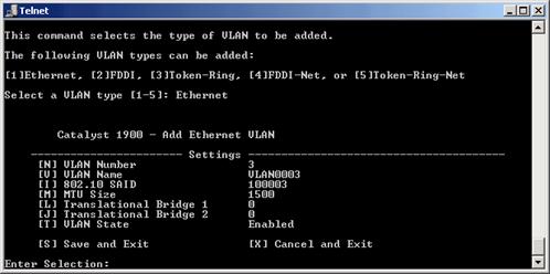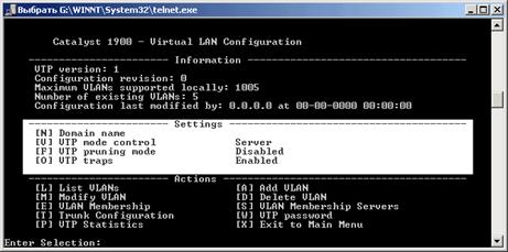 Для свитчей серии CISCO Catalyst 1900 нет поддержки мультиVLAN и вы должны назначать портам только типы static и trunk. Для управления коммутатором через CLI используется весьма удобная система меню: