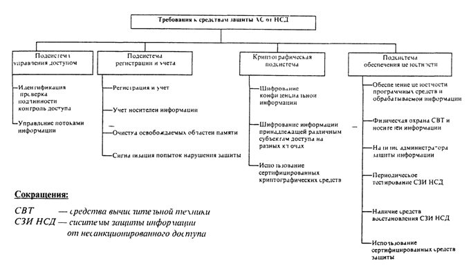 Данные требования являются составной частью критериев защищенности автоматизированных систем обработки информации от НСД Требования сгруппированы вокруг peaлизующих их подсистем защиты. В отличие от остальных стандартов, отсутствует раздел содержащий требования по обеспечению работоспособности системы, зато присутствует раздел, посвященный криптографическим средствам (другие стандарты не содержат даже упоминания о криптографии, так как рассматривают ее исключительно в качестве механизма, реализующего остальные требования, такие, как аутентификацию, контроль целостности и т.д.). Таксономия требований к средствам защиты AC от НСД приведена на рис 2.3.