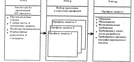 Разработка профиля защиты осуществляется в три этапа: анализ среды применения ИТ-продукта с точки зрения безопасности, выбор профиля-прототипа и синтез требований. На рис. 2.4 приведена общая схема разработки профиля защиты.