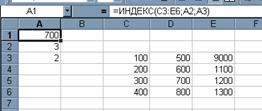 Эта формула использует координату строки (3), находящуюся в ячейке А2, и координату столбца (2), находящуюся в ячейке A3, для определения адреса ячейки, расположенной в третьей строке второго столбца диапазона СЗ:Е6, то есть D5. Но в ячейке А1 Excel отображает содержимое ячейки D5, а именно число 700.