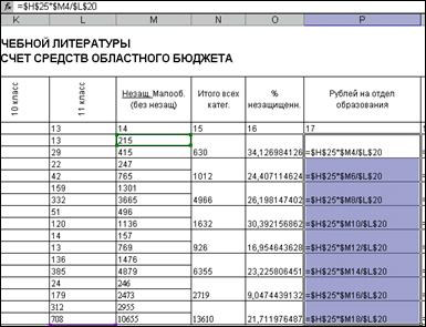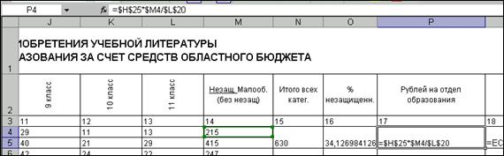 Чтобы посчитать сколько денег сдали ученики по городам в отдельности нужно использовать функцию СРЗНАЧ. Выделим ячейку Р4 и введём формулу =$H$25*$M4/$L$20.