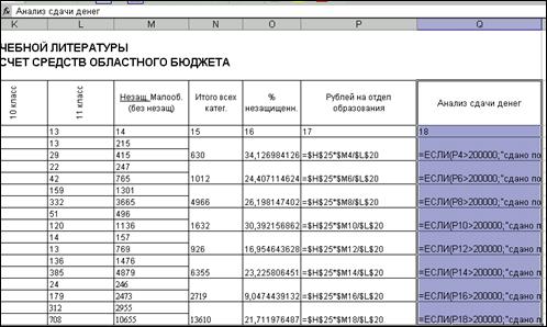 На основе сумм сданных на отдел образования мы делаем анализ сдчи денег. Для этого нам надо открыть окно функции ЕСЛИ и в появившемся окне задать условие Р4>200000. Задать истину «сдано полн.» и лож «не сдано». И после этого нажать ОК. Затем копировать функцию на остальные ячейки.