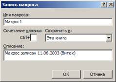 Например, Excel не записывает выделение ячейки, пока не выполнить в ней некоторое действие, например форматирование или редактирование. Подобным образом, в макрос не записывается команда меню, которая открывает окно диалога, пока не будет нажата кнопка ОК в этом окне. Если нажать в нем кнопку Отмена, то Excel не включит данную команду в макрос.