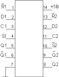 У каждого триггера есть входы D, S и R, а так же комплиментарные выходы Q и Q. Входы R и S – асинхронные, потому что они работают независимо от сигнала на тактовом входе. Напряжение питания +5В подаётся на контакт 14, а питание 0В на контакт 7.