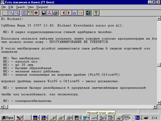 WINVN - программа для чтения телеконференцийРефераты >> Программирование и компьютеры >> WINVN - программа для чтения телеконференций