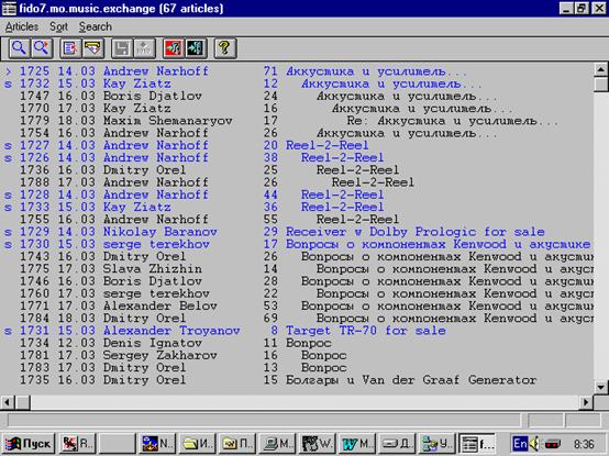 Чтобы прочитать статьи, относящиеся к какой-либо телеконференции, надо дважды щелкнуть на имени телеконференции в основном окне. Чтобы просмотреть содержание телеконференции, совсем не обязательно быть на нее подписанным. После выбора имени появляется окно телеконференции, пример которого показан на рис. 5.