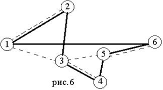 2. “Деревянный” алгоритм вначале строит остовное дерево, показанное на рис. 6 штриховой линией, затем эйлеров цикл 1-2-1-3-4-3-5-6-5-3-1, затем тур 1-2-3-4-5-6-1 длиной 43, который показан сплошной линией на рис. 6.