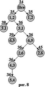 Для получения оценки положительного варианта исключаем из матрицы первую строку и третий столбец, ставим запрет (3,1) и получаем матрицу. Эта матрица приводится по четвертой строке на 1, оценка класса достигает 36 и кружок зачеркивается. Поскольку у вершины «все» убиты оба потомка, она убивается тоже. Вершин не осталось, перебор окончен. Мы получили тот же минимальный тур, который показан подчеркиванием на табл. 2.