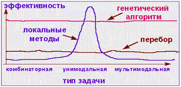 скрещивания и мутации в каком-то смысле реализуют переборную часть метода, а отбор лучших решений - градиентный спуск. На рисунке показано, что такая комбинация позволяет обеспечить устойчиво хорошую эффективность генетического поиска для любых типов задач.