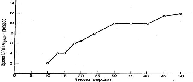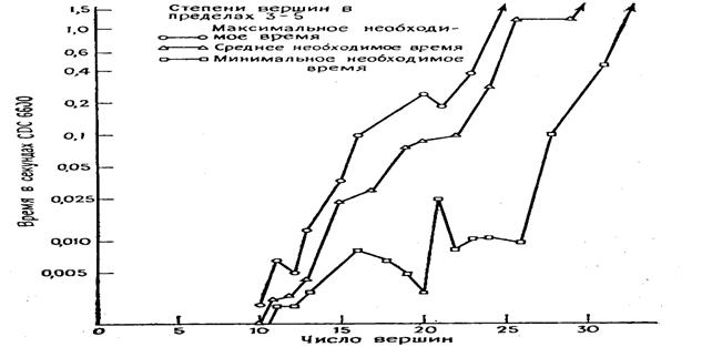 Ниже на рисунке 1 показана зависимость требуемого алгоритмом Робертса и Флореса времени вычисления от числа вершин графа; степени вершин лежат в пределах 3 — 5. Ввиду сильных вариаций требуемого времени для графов одинаковых размеров приводятся три ломанные, характеризующие среднее, максимальное и минимальное время, полученное для различных графов с одинаковым числом вершин. Следует заметить, что на рисунке 1 применен полулогарифмический масштаб, что говорит об экспоненциальном характере зависимости. Формула, дающая приближенную зависимость времени T от числа вершин n графа со степенями вершин в пределах 3 — 5, такова: