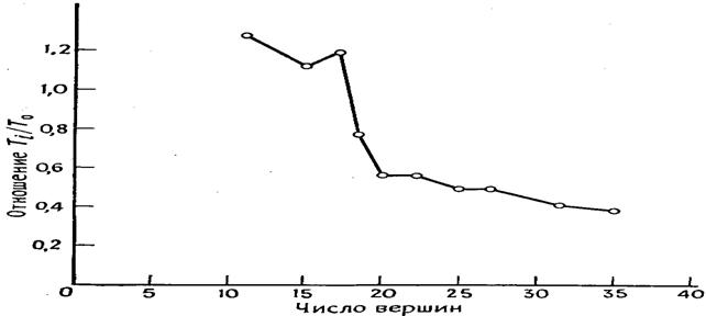 Улучшенный вариант алгоритма Робертса и Флореса не намного лучше первоначального алгоритма. Необходимое время вычисления в нем все еще зависит (более или менее) экспоненциально от n. Зависимость отношения времен вычисления при использовании этих двух алгоритмов для неориентированных графов со степенями вершин 3 — 5 приведена на рисунке 2. Из этого рисунка видно, что «улучшенный» вариант в действительности хуже для графов малых размеров, хотя для больших графов (с более чем 20 вершинами) он позволяет сэкономить более 50% времени вычисления.
