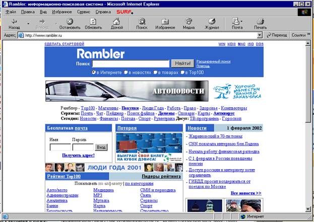 Inernet Explorer (IE) поставляется пользователям вместе с операционной системой Microsoft Windows 95/98/ME/2000, и для работы в IE необходимо иметь доступ в глобальную сеть Internet. Для просмотра электронных досок объявлений (страниц) необходимо ввести адрес нужной вам страницы в ячейку: "Address:" и нажать ENTER.