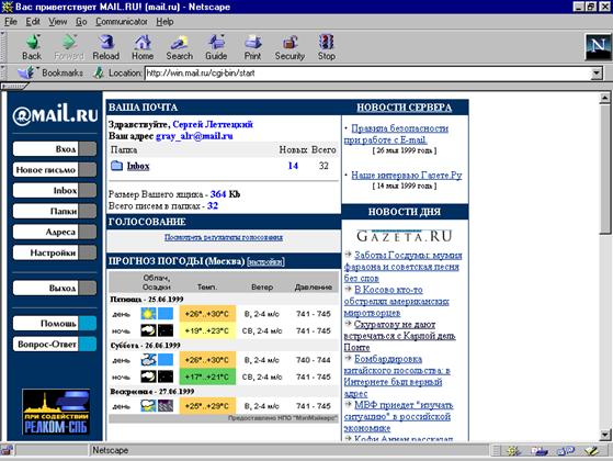 На рисунке показан графический интерфейс Web-броузера Netscape Navigator (версия 4.04) с открытой страничкой электронной почты (www.mail.ru).