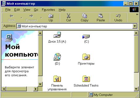 На рисунке представлено окно My Computer. Как видно из рисунка, окно состоит из следующих основных частей: системное меню, заголовок, кнопка «Свернуть», кнопка «Развернуть/Восстановить», кнопка «Закрыть», строка меню, рамка окна.