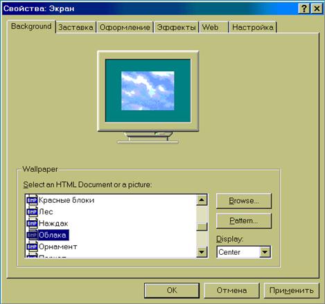 Как сменить сукно на бильярдном столе? Снять старое и натянуть новое. Сменить «сукно», то бишь фон рабочего стола, можно с помощью окна свойств (Properties) экрана. Чтобы открыть окно свойств, необходимо нажать кнопку Start, выбрать в главном меню пункт Settings, а в нем папку Control Panel. Откройте папку Control Panel, дважды щелкнув на ней левой клавишей мыши, и в скрывшемся окне дважды щелкните на пиктограмме Display. На мониторе появится диалоговое окно свойств экрана.