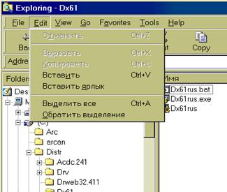 • Открытие меню. Обычно одна буква в строке меню подчеркнута. Для открытия меню одновременно либо поочередно нажмите клавишуAlt и подчеркнутую букву. Второй способ — нажмите и отпустите Alt, а затем выберите необходимый пункт стрелками управления курсором.