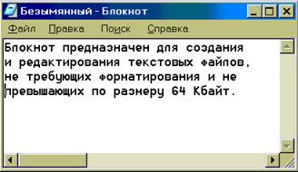 Блокнот предназначен для создания и редактирования текстовых файлов, не требующих форматирования и не превышающих по размеру 64 Кбайт.