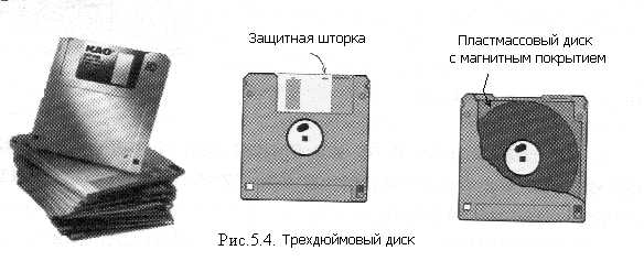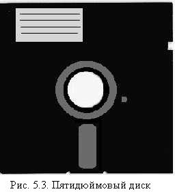 Гибкие магнитные диски (ГМД) предназначены для переноса документов и программ с одного компьютера на другой, хранения архивных копий и информации, не используемой постоянно на компьютере. Гибкий МД диаметром 5,25 дюйма (133 мм) в настоящее время может хранить до 1,2 Мб информации (рис. 5.3).