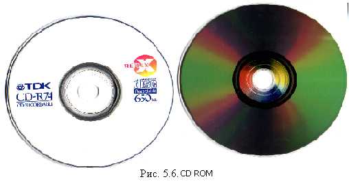 Диски CD-ROM (Compact Disk Read Only Memory, рис. 5.6) обладают емкостью до 3 Гб, высокой надежностью хранения информации, долговечностью (прогнозируемый срок его службы при качественном исполнении — до 30—50 лет). Диаметр диска может быть как 5,25 дюйма, так и 3,5.