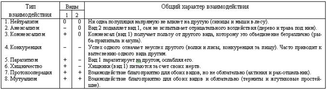 Различают несколько форм межвидовых взаимодействий и несколько классификаций взаимоотношений между видами. Остановимся на двух из них. Если обозначить безразличные для вида взаимоотношения 0, полезные +, а вредные - для партнеров, то все многообразие взаимоотношений можно обозначить: 00, 0+, 0-, ++, +-, - -.