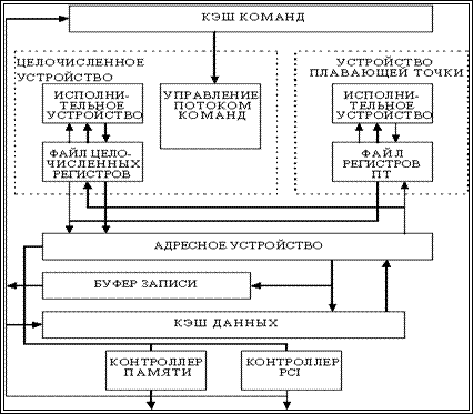 В настоящее время семейство микропроцессоров с архитектурой Alpha представлено несколькими кристаллами, имеющими различные диапазоны производительности, работающие с разной тактовой частотой и рассеивающие разную мощность. Первым на рынке появился 64-разрядный микропроцессор Alpha (DECchip 21064) . Он представляет собой RISC-процессор в однокристальном исполнении, в состав которого входят устройства целочисленной и плавающей арифметики, а также кэш-память емкостью 16 Кб. Кристалл проектировался с учетом реализации передовых методов увеличения производительности, включая конвейерную организацию всех функциональных устройств, одновременную выдачу нескольких команд для выполнения, а также средства организации симметричной многопроцессорной обработки. В кристалле имеются два регистровых файла по 32 64-битовых регистра: один для целых чисел, второй - для чисел с плавающей точкой. Для обеспечения совместимости с архитектурами MIPS и VAX архитектура Alpha поддерживает арифметику с одинарной и двойной точностью как в соответствии со стандартом IEEE 754, так и в соответствии с внутренним для компании стандартом арифметики VAX. Самая мощная модель процессора 21064 работает на частоте 200 МГц. В конце 1993 года появилась модернизированная версия кристалла - модель 21064А, имеющая на кристалле кэш-память удвоенного объема и работающая с тактовой частотой 275 МГц. Затем были выпущены модели 21066 и 21068, оперирующие на частоте 166 и 66 МГц. Отличительной особенностью этой ветви процессоров Alpha является реализация на кристалле шины PCI. Это существенно упрощает и удешевляет как проектирование, так и производство компьютеров. Отличительная особенность модели 21068 - низкая потребляемая мощность (около 8 ватт). Основное предназначение этих двух новых моделей - персональные компьютеры и одноплатные ЭВМ. На рисунке 3. представлена блок-схема микропроцессора 21066. Основными компонентами этого процессора являются: кэш-память команд, целочисленное устройство, устройство плавающей точки, устройство выполнения команд загрузки/записи, кэш-память данных, а также контроллер памяти и контроллер ввода/вывода.