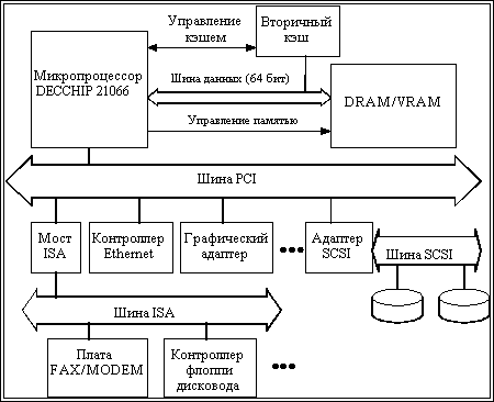 Высокоскоростная шина PCI имеет ряд привлекательных свойств. Помимо возможности работы с прямым доступом к памяти и программируемым вводом/выводом она допускает специальные конфигурационные циклы, расширяемость до 64 бит, компоненты, работающие с питающими напряжениями 3.3 и 5 В, а также более быстрое тактирование. Базовая реализация шины PCI поддерживает мультиплексирование адреса и данных и работает на частоте 33 МГц, обеспечивая максимальную скорость передачи данных 132 Мбайт/с. Шина PCI непосредственно управляется микропроцессором. На рисунке 4 показаны некоторые высокоскоростные периферийные устройства: графические адаптеры, контроллеры SCSI и сетевые адаптеры, подключенные непосредственно к шине PCI. Мостовая микросхема интерфейса ISA позволяет подключить к системе низкоскоростные устройства типа модема, флопа и т.д. Позже, на смену процессору пришла его модернизированная версия. Как и его предшественник, новый кристалл Alpha 21066A помимо интерфейса PCI содержит на кристалле интегрированный контроллер памяти и графический акселератор. Эти характеристики позволяют значительно снизить стоимость реализации систем, базирующихся на Alpha 21066A, и обеспечивают простой и дешевый доступ к внешней памяти и периферийным устройствам. Alpha 21066A имеет две модификации в соответствии с частотой: 100 МГц и 233 МГц. Модель с 233 МГц обеспечивает производительность 94 и 100 единиц, соответственно, по тестам SPECint92 и SPECfp92. Микропроцессор Alpha 21164 представляет собой вторую полностью новую реализацию архитектуры Alpha. Микропроцессор 21164, представленный в сентябре 1994 года, обеспечивает производительность 330 и 500 единиц, соответственно, по шкалам SPECint92 и SPECfp92 или около 1200 MIPS и выполняет до четырех инструкций за такт. На кристалле микропроцессора 21164 размещено около 9,3 миллиона транзисторов, большинство из которых образуют кэш. Кристалл построен на базе 0.5 микронной КМОП технологии компании DEC. Он собирается в 499-контактные корпуса PGA (при этом 205 контактов отводятся под разводку питания и земли) и рассеивает 50 Вт при питающем напряжении 3.3 В на частоте 300 МГц. Переход в 1996 году на 0.35 микронную КМОП технологию привел к возможности дальнейшего увеличения тактовой частоты и производительности процессора. Процессоры 21164 выпускались с тактовой частотой 366 МГц (11.3 SPECint95, 15.4 SPECfp95) и 433 МГц (13.3 SPECint95, 18.3 SPECfp95). В конце 1996 года начались массовые поставки 21164 с тактовой частотой 500 МГц (15.4 SPECint95, 21.1 SPECfp95). Таким образом, в 1996г. компания DEC имела самые мощные процессоры, пиковая производительность которых составляла 2 миллиарда операций в секунду.