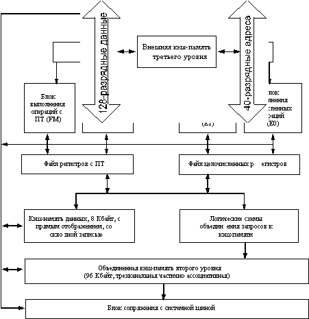 Ключевыми моментами для реализации высокой производительности является суперскалярный режим работы процессора, обеспечивающий выдачу для выполнения до четырех команд в каждом такте, высокопроизводительная неблокируемая подсистема памяти с быстродействующей кэш-памятью первого уровня, большая, размещенная на кристалле, кэш-память второго уровня и уменьшенная задержка выполнения операций во всех функциональных устройствах. На рисунке 5 представлена блок-схема процессора, который включает пять функциональных устройств: устройство управления потоком команд (IBOX), целочисленное устройство (EBOX), устройство плавающей точки (FBOX), устройство управления памятью (MBOX) и устройство управления кэш-памятью и интерфейсом шины (CBOX). На рисунке также показаны три расположенных на кристалле кэш-памяти. Кэш-память команд и кэш-память данных представляют собой первичные кэши, реализующие прямое отображение. Множественно-ассоциативная кэш-память второго уровня предназначена для хранения команд и данных. Длина конвейеров процессора 21164 варьируется от 7 ступеней для выполнения целочисленных команд и 9 ступеней для реализации команд с плавающей точкой до 12 ступеней при выполнении команд обращения к памяти в пределах кристалла и переменного числа ступеней при выполнении команд обращения к памяти за пределами кристалла. Устройство управления потоком команд осуществляет выборку и декодирование команд из кэша команд и направляет их для выполнения в соответствующие исполнительные устройства после разрешения всех конфликтов по регистрам и функциональным устройствам. Оно управляет выполнением программы и всеми аспектами обработки исключительных ситуаций, ловушек и прерываний. Кроме того, оно обеспечивает управление всеми исполнительными устройствами, контролируя все цепи обхода данных и записи в регистровый файл. Устройство управления содержит 8 Кбайт кэш команд, схемы предварительной выборки команд и связанный с ними буфер перезагрузки, схемы прогнозирования направления условных переходов и буфер преобразования адресов команд (ITB). Целочисленное исполнительное устройство выполняет целочисленные команды, вычисляет виртуальные адреса для всех команд загрузки и записи, выполняет целочисленные команды условного перехода и все другие команды управления. Оно включает в себя регистровый файл и несколько функциональных устройств, расположенных на четырех ступенях двух параллельных конвейеров. Первый конвейер содержит сумматор, устройство логических операций, сдвигатель и умножитель. Второй конвейер содержит сумматор, устройство логических операций и устройство выполнения команд управления.