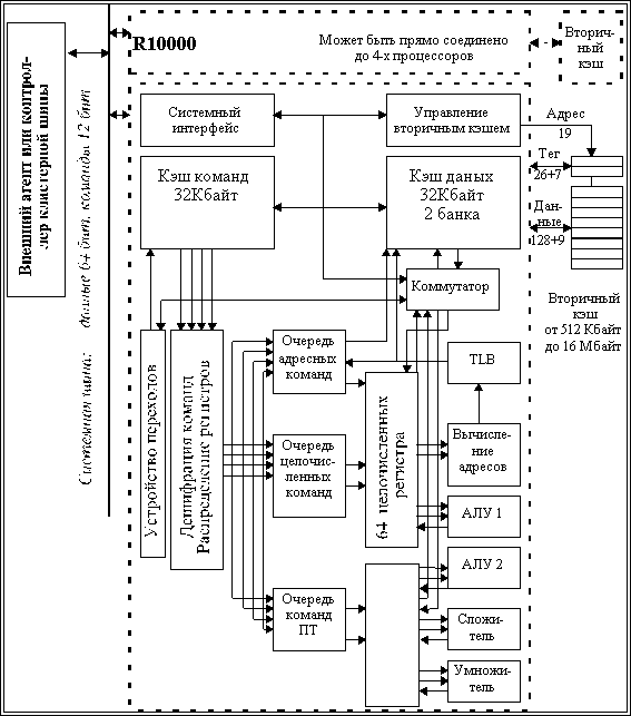 Массивы данных и тегов в каждом банке являются независимыми. Эти четыре массива работают под общим управлением очереди формирования адресов памяти и схем внешнего интерфейса кристалла. В очереди адресов могут одновременно находиться до 16 команд загрузки и записи, которые обрабатываются в четырех отдельных конвейерах. Команды из этой очереди динамически выдаются для выполнения в специальный конвейер, который обеспечивает вычисление исполнительного виртуального адреса и преобразование этого адреса в физический. Три других параллельно работающих конвейера могут одновременно выполнять проверку тегов, осуществлять пересылку данных для команд загрузки и завершать выполнение команд записи в память. Хотя команды выполняются в строгом порядке их расположения в памяти, вычисление адресов и пересылка данных для команд загрузки могут происходить неупорядоченно. Схемы внешнего интерфейса кристалла могут выполнять заполнение или обратное копирование строк кэш-памяти, либо операции просмотра тегов. Такая параллельная работа большинства устройств процессора позволяет R10000 эффективно выполнять реальные многопроцессорные приложения.