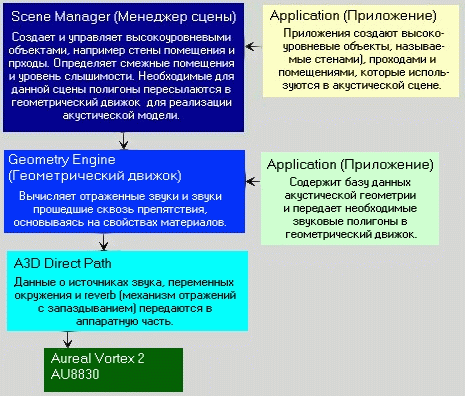 Существуют три главных компонента: интерфейс A3D, geometry engine (геометрический движок, определяющий геометрию объектов в пространстве) и scene manager (менеджер сцены). Интерфейс A3D является основным компонентом. Один в отдельности он используется для реализации прямых путей распространения звука (direct path). Geometry engine является основным компонетом для обсчета отраженных и прошедших сквозь препятсвия акустических звуковых волн или для Acoustic Wavetracing. Менеджер сцены используется как геометрическим движком, так и интерфейсом A3D для управления сложными звуковыми сценами. Обработка каждого из этих компонетов будет производиться именно в таком порядке.