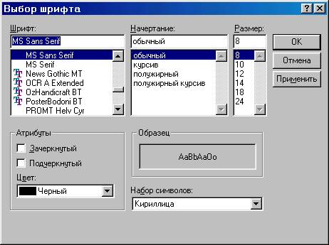 2. В меню Правка выберите команду Шрифт. Откроется диалоговое окно показанное на рисунке 1.4.
