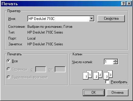 1. Чтобы сменить принтер, нажмите кнопку Печать. Откроется диалоговое окно показанное на рисунке 1.5. Выберите имя принтера в поле со списком Имя.
