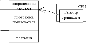 В процессе выполнения программы все её адреса не должны быть меньше числа а. В противном случае возможна запись какого-либо результата работы программы (поверх операционной системы) и уничтожение некоторых её частей. Защиту операционной системы в случае смежного размещения при однопрограммном режиме можно осуществить с помощью регистра границы.