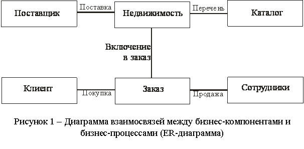 В простейшем виде информационная модель может быть отображена в виде взаимосвязей между бизнес-компонентами и бизнес-процессами, как это показано на рисунке 3. В практике проектирования информационных систем такие схемы получили название ER-диаграмм (Entity-relationship diagram (ERD) – диаграмма «Сущность-связь»). ER-диаграммы хорошо вписываются в методологию структурного анализа и проектирования информационных систем. Такие методологий обеспечивают строгое и наглядное описание проектируемой системы, которое начинается с ее общего обзора и затем уточняется, давая возможность получить различнуюстепень детализации объекта с различным числом уровней.