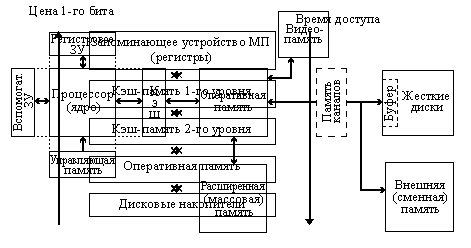Ключевым принципом построения памяти ЭВМ является ее иерархическая организация (принцип, сформулированный еще Джоном фон Нейманом), которая предполагает использование в системе памяти компьютера запоминающих устройств (ЗУ) с различными характеристиками. Причем с развитием технологий, появлением новых видов ЗУ и совершенствованием структурной организации ЭВМ, количество уровней в иерархии памяти ЭВМ не только не уменьшается, но даже увеличивается. (Например, сверхоперативные ЗУ больших ЭВМ 50-60-х годов, заменяет двухуровневая кэш-память персональных ЭВМ 90-х годов.)