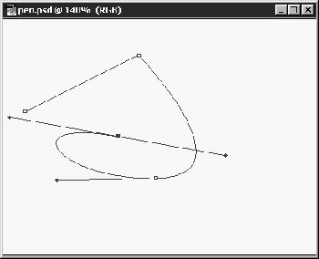 7. Чтобы пояснить сказанное выше более подробно, нарисуйте еще один криволинейный фрагмент. Переместите указатель в центр окна, щелкните кнопкой мыши и перетащите указатель вправо и слегка вниз. Снова будет создан сглаженный узел и криволинейный фрагмент, как показано на рис.12.