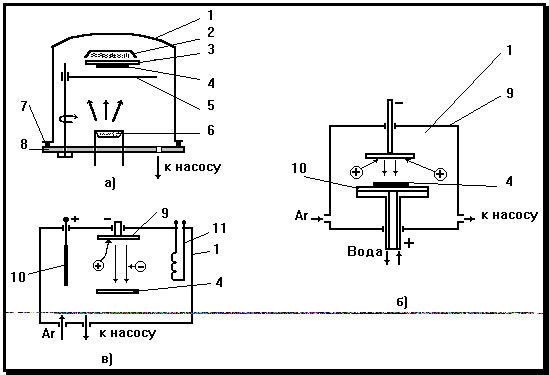Катодным (ионным) распылением (Рис. 5, б) называют процесс, при котором в диодной системе катод-мишень 9, выполненный из распыляемого материала, оседающие в виде тонкой пленки на подложке 4. Ионизация инертного газа осуществляется электронами, возникающими между катодом-мишенью 9 и анодом 10 при U= 3-5 кВ и давлении аргона 1-10 Па.