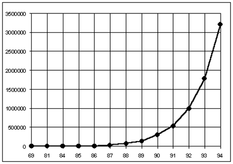 Эта диаграмма иллюстрирует рост чис-ла хостов, подключен-ных к сети Internet с 4 компьютеров в 1969 году до 3,2 миллионов в 1994. Хостом в сети Internet называются компьютеры, работаю-щие в многозадачной операционной системе (Unix, VMS), поддер-живающие протоколы TCP/IP и предостав-ляющие пользователям какие-либо сетевые услуги.