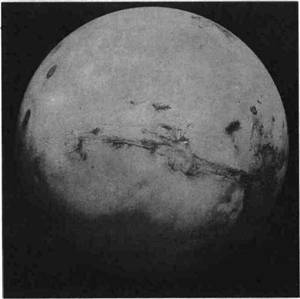 Рис. 1. Изображение Марса, составленное в начале 90-х годов американскими учеными, по данным фотографирования планеты с близкого расстояния хорошо заметен каньон Марине, протяженностью до 1000 км.