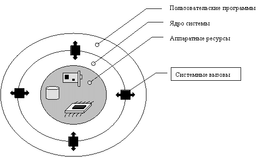 В центре находятся аппаратные ресурсы компьютера с которыми непосредственно взаимодействует ядро операционной системы изолируя прикладные программы пользователя от особенностей аппаратной архитектуры. Ядро имеет определенный минимальный набор услуг представляемых прикладным программам. В первую очередь это операции ввода-вывода (открытие, закрытие, чтение, запись и управление файлами), создание и управление процессами, организация синхронизации и обмена данными между процессами, управление памятью (реальной и виртуальной).