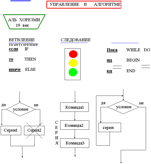 Одна или несколько команд, которые в алгоритме рассматриваются как одно целое и называются серией, изображаются в прямоугольнике с одним входом и одним выходом; условие - в ромбе с одним входом и двумя выходами, над которыми написаны слова «да» и «нет», означающие выполнение и невыполнение условия соответственно.