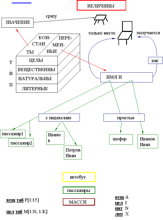 Для пояснения сути этой классификации на ЛОС использован сигнал в виде автобуса. Шофер - это простая величина, являющаяся именем переменной. В автобусе он один. Но на одном автобусе может работать не один шофер. Значит, это имя может иметь разные значения. Автобус перевозит пассажиров. Они образуют массив переменных. Общее имя этого массива - ПАССАЖИР. В автобусе каждый пассажир полностью определяется номером места, которое он занимает. К каждому из них можно обратиться: